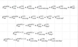 where i(j) is the orders of V(W). By grouping together different orders of the corrections above, SAPT decompose the interaction energy into four energy terms, namely, electrostatics, induction, exchange and dispersion: